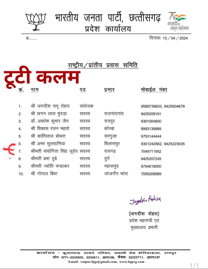 🏹टिल्लू शर्मा ✒️टूटी कलम 🎤न्यूज रायगढ़ छत्तीसगढ़ …….लोकसभा चुनाव के मद्देनजर भारतीय जनता पार्टी छत्तीसगढ के प्रदेश महामंत्री एवं मुख्यालय प्रभारी जगदीश रोहरा ने राष्ट्रीय प्रांतीय प्रवास समिति के लिए छत्तीसगढ़ के अलग-अलग लोकसभाओं के लिए प्रभारियों की नियुक्ति की है । इसमें रायगढ़ लोकसभा के लिए दिवंगत कुमार दिलीप सिंह जूदेव, जशपुर राजघराने की छोटी बहू संयोगिता/ युद्धवीर सिंह जूदेव को राष्ट्रीय/ प्रांतीय प्रवास समिति का प्रभारी बनाया गया है ।