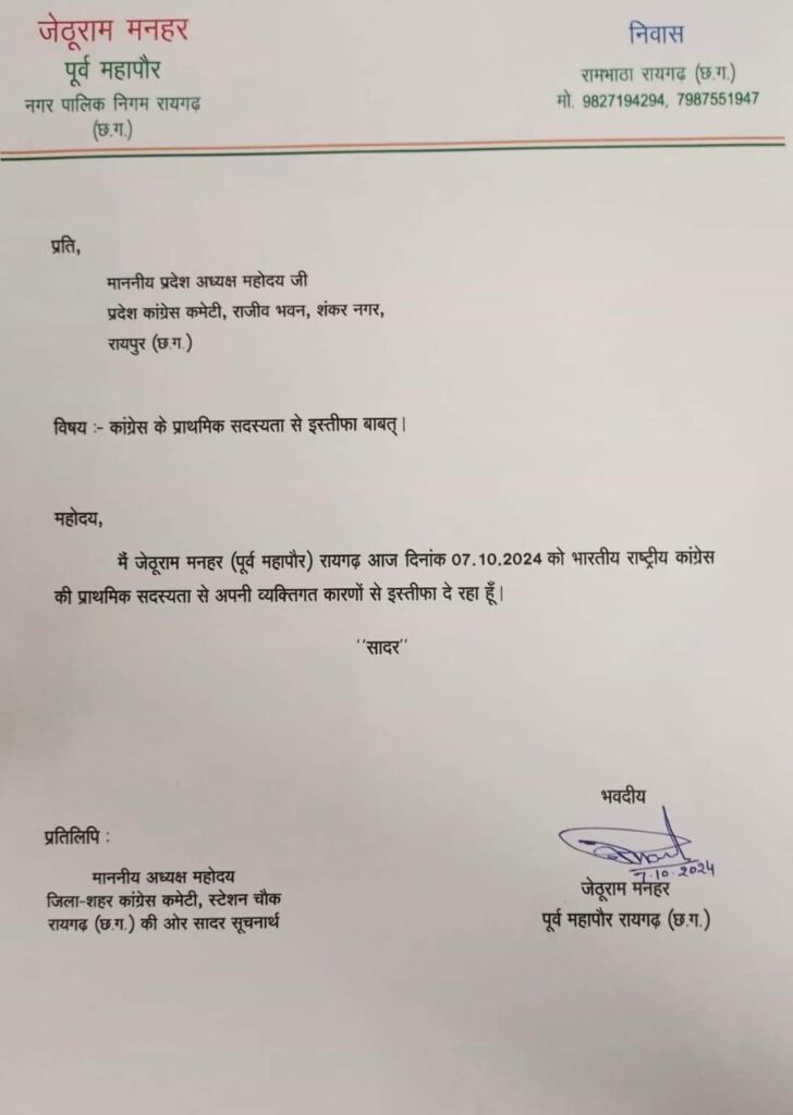 рдкреВрд░реНрд╡ рдорд╣рд╛рдкреМрд░ рдЬреЗрдареВ рд░рд╛рдо рдиреЗ рдХрд╛рдВрдЧреНрд░реЗрд╕ рдХреА рдкреНрд░рд╛рдердорд┐рдХ рд╕рджрд╕реНрдп рд╕реЗ рдЗрд╕реНрддреАрдлрд╛ рджрд┐рдпрд╛.тАжрд░рд╛рдпрдЧрдврд╝ рдирдЧрд░ рдирд┐рдЧрдо рдХреЗ рдкрд╣рд▓реЗ рдорд╣рд╛рдкреМрд░ рдХрд╛рдВрдЧреНрд░реЗрд╕ рдиреЗрддрд╛ рдЬреЗрдареВ рд░рд╛рдо рдордирд╣рд░ рдиреЗ рдХрд╛рдВрдЧреНрд░реЗрд╕ рдХреА рдкреНрд░рд╛рдердорд┐рдХ рд╕рджрд╕реНрдпрддрд╛ рд╕реЗ рдЗрд╕реНрддреАрдлрд╛ рджреЗ рджрд┐рдпрд╛ рд╣реИ. рдЙрдиреНрд╣реЛрдВрдиреЗ рдЕрдкрдирд╛ рдЗрд╕реНрддреАрдлрд╛ рдкреНрд░рджреЗрд╢ рдЕрдзреНрдпрдХреНрд╖ рдХреЛ рдкреНрд░реЗрд╖рд┐рдд рдХрд░ рджрд┐рдпрд╛ рд╣реИ. рд╢рд╛рдпрдж рдЬреЗрдареВ рд░рд╛рдо рдордирд╣рд░ рдиреЗ рдХрд╛рдВрдЧреНрд░реЗрд╕ рдЫреЛрдбрд╝рдиреЗ рдХрд╛ рдирд┐рд░реНрдгрдп рд╣рдбрдмрдбрд╝реА рдореЗрдВ рд▓рд┐рдпрд╛ рдЧрдпрд╛ рд╣реИ рдХреНрдпреЛрдВрдХрд┐ рджрд┐рд╕рдВрдмрд░ рдореЗрдВ рдирдЧрд░реАрдп рдЪреБрдирд╛рд╡ рд╣реЛрдиреЗ рд╣реИрдВ. рд╣реЛ рд╕рдХрддрд╛ рдерд╛ рдХрд┐ рдХрд╛рдВрдЧреНрд░реЗрд╕ рдХреА рддрд░рдл рд╕реЗ рдЬреЗрдареВрд░рд╛рдо рдордирд╣рд░ рдХрд╛ рдирд╛рдо рдорд╣рд╛рдкреМрд░ рдХреЗ рд▓рд┐рдП рд╕рд╛рдордиреЗ рд▓рд╛рдпрд╛ рдЬрд╛ рд╕рдХрддрд╛ рдерд╛. рд╡реИрд╕реЗ рдЖрдЧрд╛рдореА рджрд┐рдиреЛрдВ рдореЗрдВ рдЬрд┐рд▓рд╛ рдХрд╛рдВрдЧреНрд░реЗрд╕ рдЕрдзреНрдпрдХреНрд╖ рднреА рдмрджрд▓рд╛ рдЬрд╛рдирд╛ рд╣реИ. рд╣реЛ рд╕рдХрддрд╛ рдерд╛ рдХрд┐ рдЬрд┐рд▓рд╛ рдЕрдзреНрдпрдХреНрд╖ рдХреЗ рд▓рд┐рдП рдЬреЗрдареВ рд░рд╛рдо рдордирд╣рд░ рдХрд╛ рдирд╛рдо рдЖрдЧреЗ рдЖ рд╕рдХрддрд╛ рдерд╛. рдЖрдЬ рдЕрдкрдиреА рдЗрддрдиреА рдХрдЪреНрдЪреА рдЧреЛрд▓реА рдирд╣реАрдВ рдЦреЗрд▓реА рд╣реИ рдХрд┐ рд╡рд╣ рдЕрдкрдиреЗ рдкреБрд░рд╛рдиреЗ рдХрд╛рд░реНрдпрдХрд░реНрддрд╛рдУрдВ, рдиреЗрддрд╛рдУрдВ рдХреЛ рдЫреЛрдбрд╝рдХрд░ рдЬреЗрдареВ рдХреЛ рдкрд╛рд░реНрд╖рдж рдХреА рдЯрд┐рдХрдЯ рдпрд╛ рдорд╣рд╛рдкреМрд░ рдХреА рдЯрд┐рдХрдЯ рджреЗрдХрд░ рдЪреБрдирд╛рд╡ рдореЗрдВ рдЙрддрд╛рд░ рджреЗ. рдЕрдЧрд░ рдпрджрд┐ рдРрд╕рд╛ рд╣реЛрддрд╛ рд╣реИ рддреЛ рдирд┐рд╢реНрдЪрд┐рдд рд░реВрдк рд╕реЗ рднрд╛рдЬрдкрд╛ рдореЗрдВ рдмрдЧрд╛рд╡рдд рд╣реЛ рдЬрд╛рдПрдЧреА.