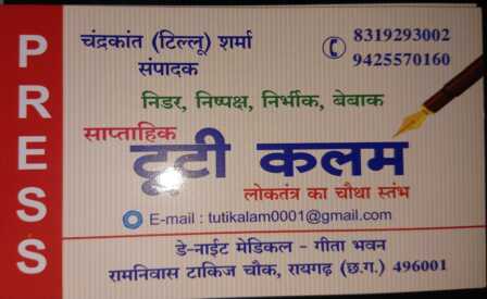 नंबर वन की तरफ तेजी से बढ़ रहा *टूटी कलम समाचार* पत्रकारिता करना हमारा शौक है, जुनून है, आदत है, दिनचर्या है, कमजोरी है,लगन है,धुन है, पागलपन है ,पत्रकारिता करना हमारे पेट भरने का साधन नहीं है, और ना ही ब्लैकमेलिंग, धमकी,चमकी,देकर, विज्ञापन के नाम पर उगाही,वसूली करने का लाइसेंस मिला हुआ है, संपादक टिल्लू शर्मा लेखक, विश्लेषक, कवि,व्यंगकार,स्तंभकार, विचारक, माता सरस्वती का उपासक,परशुराम का वंशज,रावण भक्त,कबीर से प्रभावित,कलम का मास्टरमाइंड, सही और कड़वी सच्चाई लिखने में माहिर, जहां से लोगों की सोचना बंद कर देते है हम वहां से सोचना शुरू करते है, टिल्लू शर्मा के ✍️समाचार ज्यों नाविक के तीर,🏹 देखन म छोटे लागे, घाव करे गंभीर, लोगों की पहली पसंद टूटी कलम समाचार बन चुका है, सरकार एवं जिला प्रशासन का व्यवस्थाओं समस्याओं पर ध्यान आकर्षण करवाना हमारा पहला कर्तव्य है