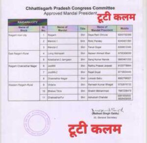 🔱टिल्लू शर्मा ✒️टूटी कलम 🎤 न्यूज रायगढ़ छत्तीसगढ़ 🌍 प्रदेश कांग्रेस कमेटी के जनरल सेक्रेटरी मलकीत सिंह ने भाजपा के तर्ज पर रायगढ़ शहर के निगम क्षेत्र में मंडल अध्यक्षों की नियुक्ति कर दी है। आने वाले चुनावो में इन मंडल अध्यक्षों की उपयोगिता मालूम चल सकेगी। वर्तमान में कांग्रेस के द्वारा भाजपा सरकार के खिलाफ धरना प्रदर्शन आंदोलन के जरिए आम जनता को कांग्रेस की नीतियों, कार्यक्रमों से अवगत करवाना होगा और जनता को कांग्रेस की तरफ आकर्षित करना होगा। भाजपा के क्रियाकलापों को जनता के सामने पेश करना होगा और भाजपा की बुराईयाँ गिनाणी पड़ेगी और यह सब वही कर सकता है जो कांग्रेस के प्रति समर्पित होगा और उसे सत्ता रूढ़ भाजपा से हर तरह की मिलने वाली प्रताड़ना और “कहर” को सहन करना पड़ेगा क्योंकि रायगढ़ के विधायक तेज तर्रार वित्त आवास योजना पर्यावरण सांख्यिकी मंत्री ओपी चौधरी है। फिलहाल कांग्रेस से राजनीति करने में वही सक्षम है। जिसका कोई वैध अवैध व्यवसाय नहीं होगा वरना इस तरह से तंग कर दिया जाएगा की लोग राजनीति से संन्यास लेने में ही अपनी भलाई समझेंगे।